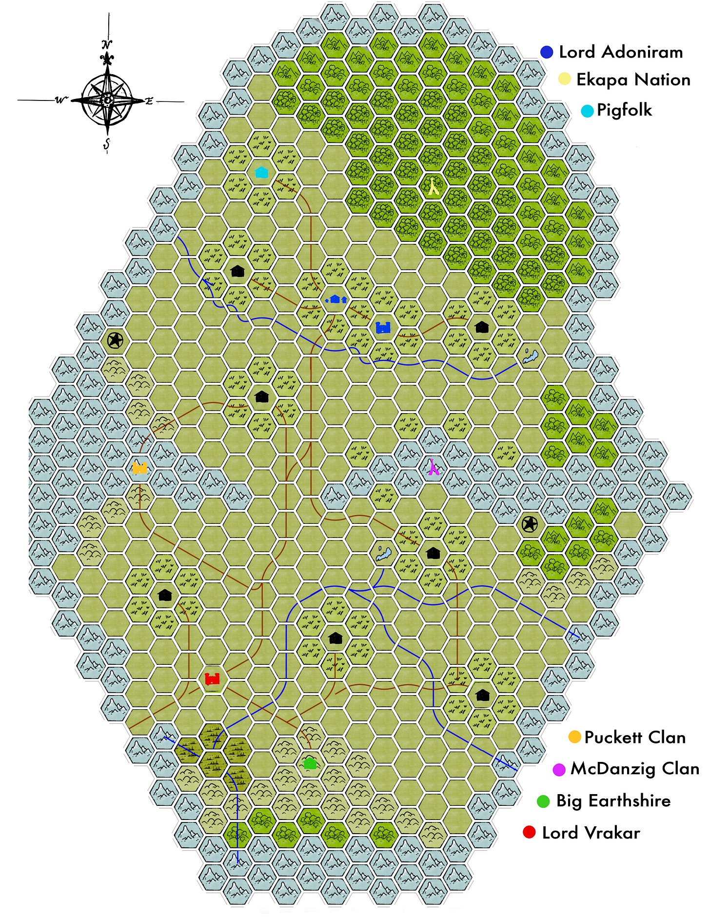 Background: The scenario took place in a valley separated into two by mountains that occupies about one thirty mile campaign hex, and the map scale is one hex to one mile. There are seven factions jammed into this one campaign hex. If something big didn’t happen I would actively begin looking for new players. The valley is a civilizational refuge on the frontier that recently had a major shake-up: The lord of the southern valley recently died without heir. The lord of the northern valley, Lord Adoniram, sent some of his knights and a small military force to occupy the southern castle. The main responsibility of the souther lord is to patrol the major pass into the valley and ensure no monsters wander in. It was of the utmost importance for that to keep happening. Unfortunately for poor ol’ Addy, Lord Vrakar the Dog Eater saw a golden opportunity and seized on it. He invaded and extricated the men from the stronghold and began to occupy it himself. First order of business, unreasonably high tributes placed on all neighbors. Next, send orcs north to begin raiding villages in Adoniram’s domain. Adoniram himself was already dealing with a blood feud with the Wood Elves near him turning into a full-blown holy war! The valleys are a powder keg, who will prevail?