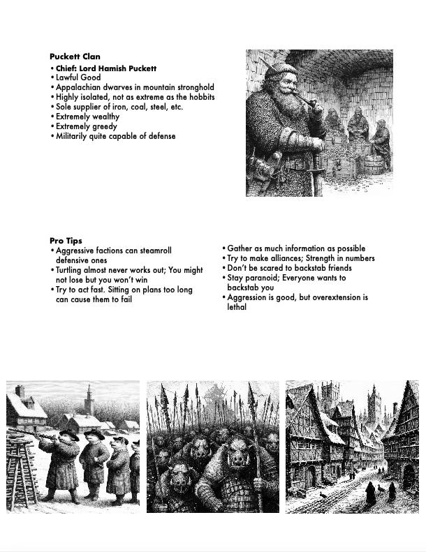 Rather than list all the domains and their details out here, I’m just going to include screenshots of the quick reference sheet I put together and link all the faction sheets, maps, and the DM sheet in PDF form hosted on dropbox. If you want the whole picture read all of them. The Ekapa Nation and Big Earthshire factions didn’t get played, so it’s not necessary to read them, but I think they were interesting factions so if you’re curious check it out.